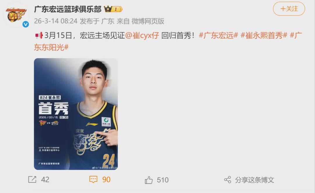 之前有球迷在评论区问小崔的复出时间,一度传出他会在3月11日对阵新疆的比赛复出。如今又推迟两场比赛,随着广东男篮官宣,小崔的复出时间也正式确定。崔永熙上一次在CBA出战是2024年4月26日,当时他还在广州男篮效力。